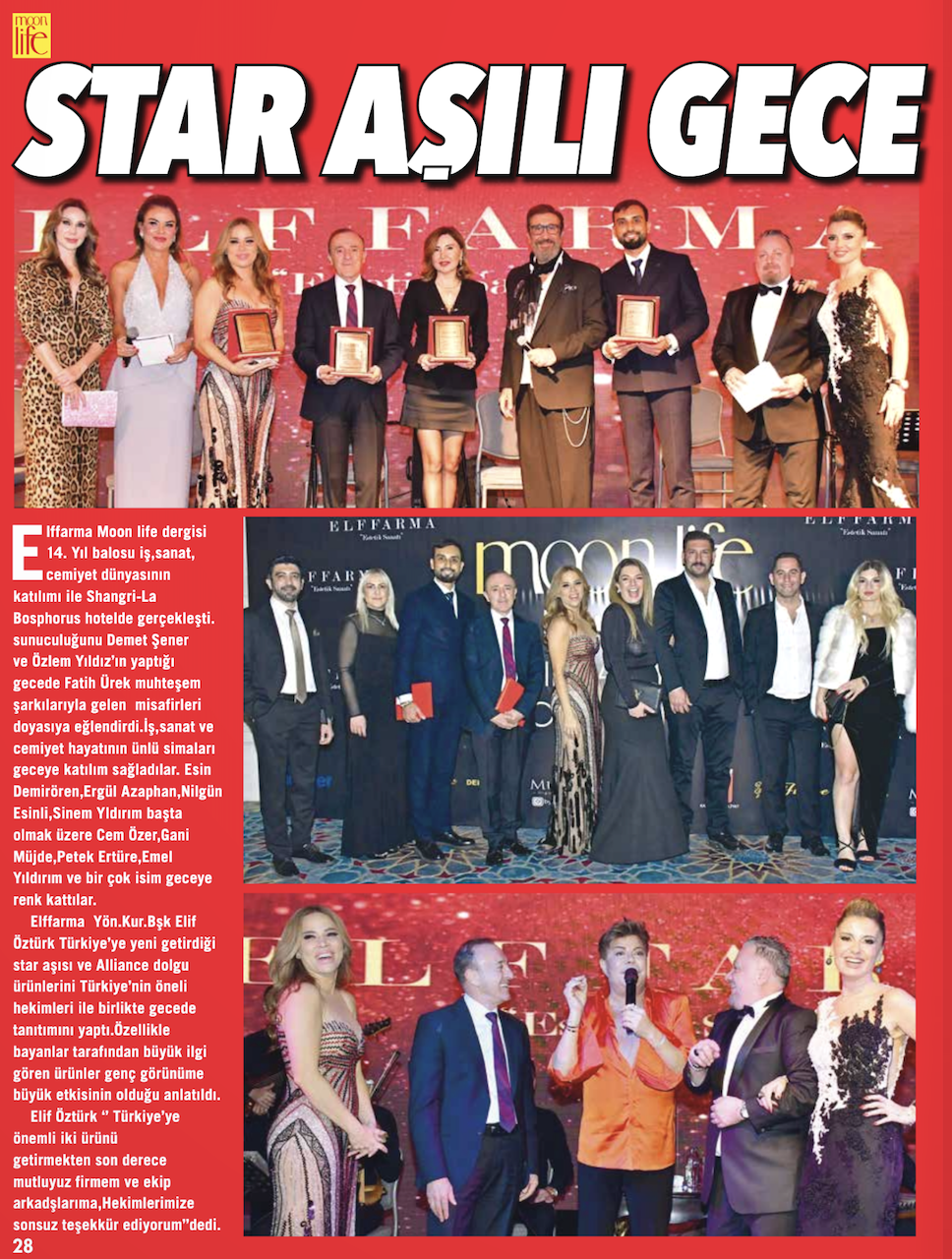 Elffarma Moon Life dergisinin 14. Yıl Balosu, iş, sanat ve cemiyet dünyasından birçok önemli ismin katılımıyla Shangri-La Bosphorus Hotel'de gerçekleşti. Geceye, sunuculuklarını ünlü isimler Demet Şener ve Özlem Yıldız'ın üstlendiği organizasyon damga vurdu. Misafirlere unutulmaz bir eğlence yaşatan etkinlikte, Fatih Ürek'in muhteşem performansı geceye renk kattı. Şarkılarıyla herkesi coşturan Ürek, davetlilere keyifli anlar yaşattı. Bu özel gece, iş ve sanat dünyasının buluşma noktası oldu.