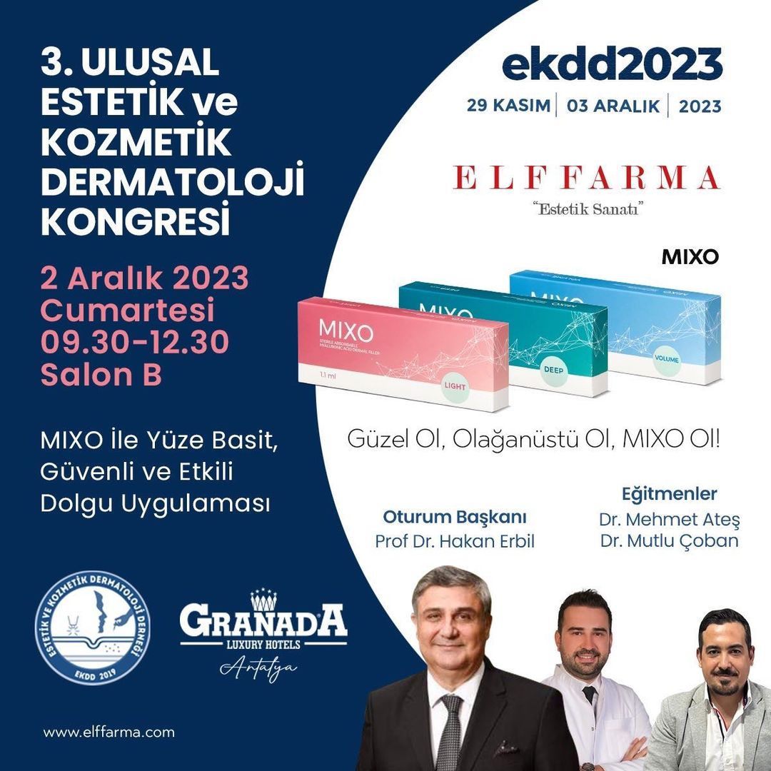 3.Ulusal Estetik ve Kozmetik Dermatoloji Kongresinde 2 Aralık cumartesi günü 4 saat sürecek olan uygulamalı dolgu eğitiminde MIXO ile yüze basit, güvenli ve etkili teknikler gösterilecektir. Oturum başkanı Prf.Dr.Hakan Erbil Eğitmen doktorlar;Dr Mehmet Ateş ,Dr Mutlu Çoban