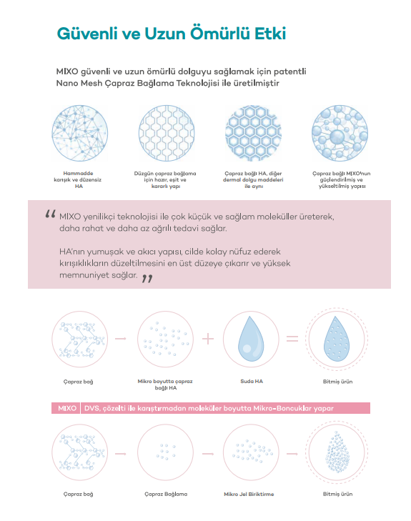 MIXO, enjekte edilebilir kozmetoloji alanında en üst sıralarda yer alan, azaltılmış çapraz bağlanma oranına, yüksek viskoziteye ve daha küçük parçacık boyutuna sahip yenilikçi bir üründür.